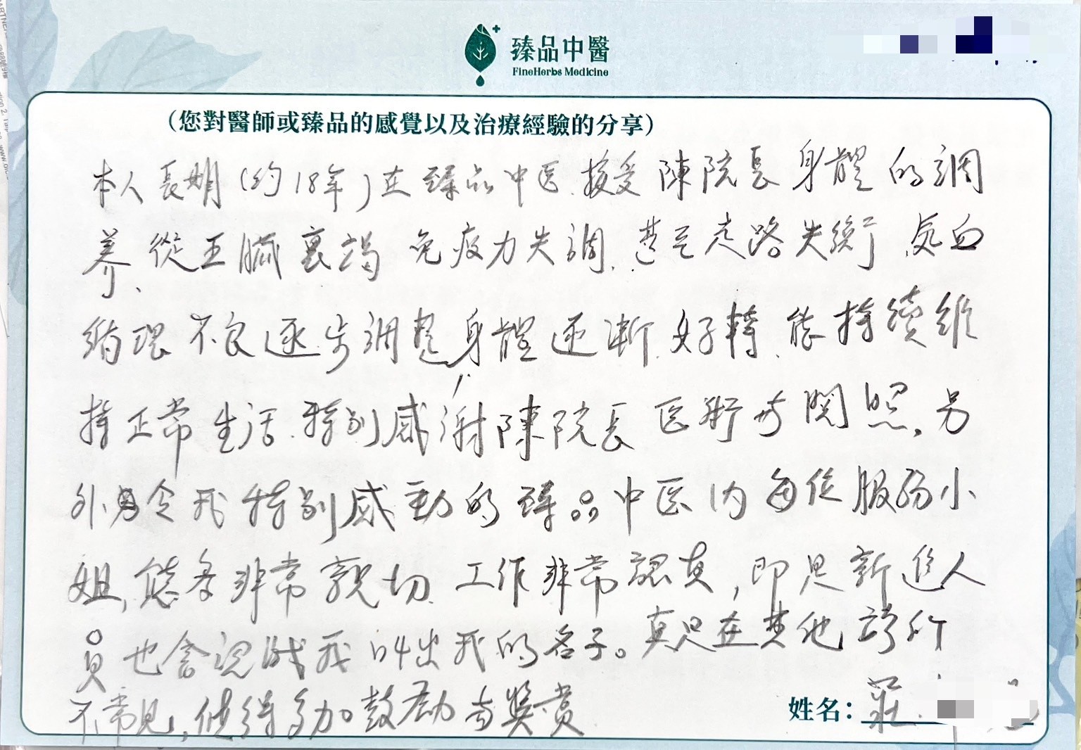 本人長期(約18年)在臻品中醫接受陳院長身體的調理,