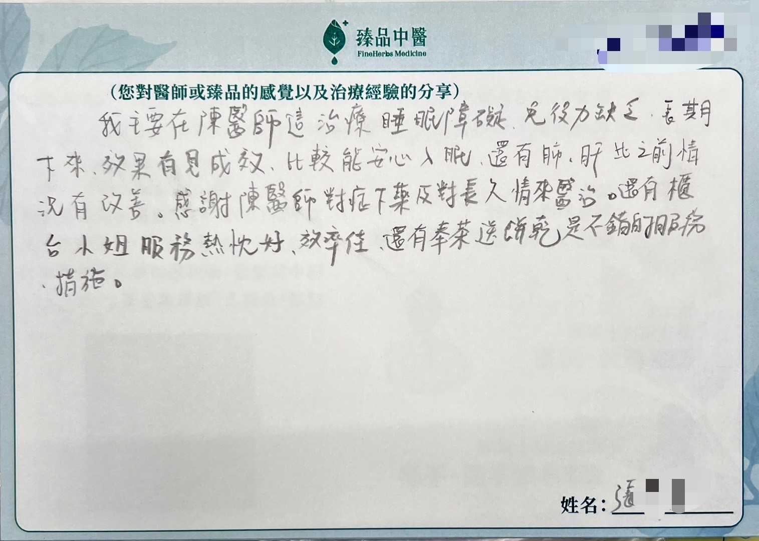 我主要在陳醫師這治療睡眠障礙、免疫力缺乏,